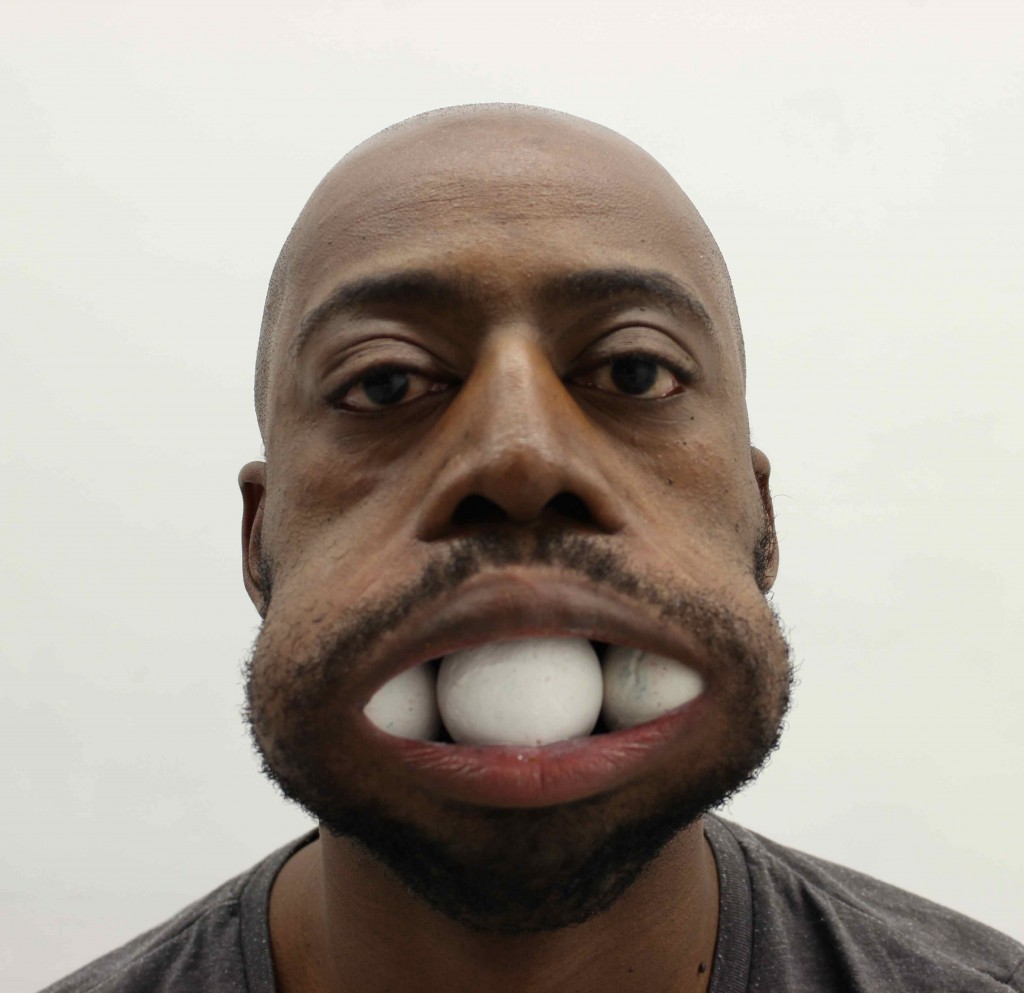I was really drawn to this image, which is such a small part of the album cover. He interested me partly because of his story. He’s an actual person called ‘Three Ball Willy’. He was a sideshow, circus guy: In the ‘20s and ‘30s he was known for being able to get a tennis ball, a golf ball and a baseball into his mouth. I was thinking about what it means to objectify oneself in a very particular way. In the past I’ve looked at the history of black and white minstrel shows. I’m really interested in self-parody. A lot of the early black minstrels, who were black, put on blackface. It’s really amazing that they were prepared to embrace this stereotype. Often where identities around race, gender or sexuality are concerned there’s an embrace of an oppressive stereotype. It can either be a political challenge or strategy.