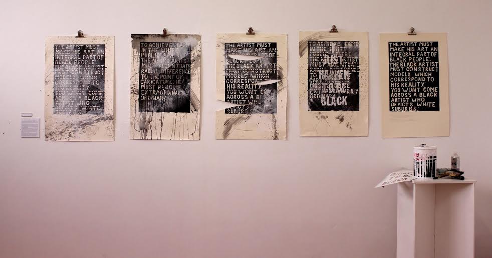 YG: On your Tumblr, and in your work, the relationship between art and race recurs. It is the theme of ‘Multi-racial, Multi-disciplinary, Multi-cultural’ (2013). You also posted a text with a line through it recently (on Twitter and on your Tumblr): ‘Unless the black artist establishes a “black aesthetic” he will have no future at all’. This work (both completed pieces and process work) is critical from the perspective of thinking about race and the art world in South Africa but also internationally.