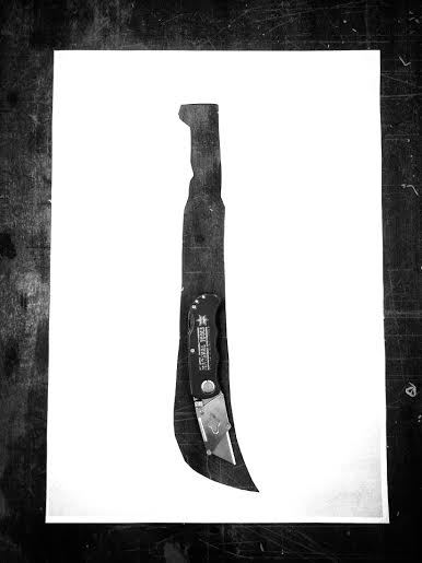 I bought a stainless panga from a hardware store, spray painted it black and engraved the word ‘Remember’ with an etching needle. The panga was stolen after the exhibition. I have made a ‘memory-work’ of that panga in the form of a collage (‘Remembering Remember’, 2014). Natasha Norman suggested that I do this: she was one of the lecturers for the ‘Remember’ project. The collage consists of a cut-out ‘ghost’ of the suspended panga which was then replaced by a craft knife. I use this craft knife almost everyday and it has appeared in earlier drawings. I am currently working on a series of etchings based on that collage.