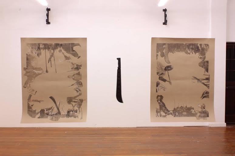 YG: Tell me about the installation ‘Remember I’ (2013). It is an installation composed of two large-scale works, in the middle of which is a found object: a panga. You inscribed the word ‘Remember’ on the blade (unfortunately it was stolen during your exhibition of the work). The panga is repeated in the images themselves: visually male figures, pangas and weapons (of various kinds) are placed in visual relationships to one another. Imagery recalls organised mass protest (central to South African political life). I see references to the police, and histories of state intervention. The imagery you deploy recalls violence; and you focus in on very particular symbols which speak directly to historical and current political events in South Africa. The work is framed by your images of figures and objects: the centre of the piece is empty, a blank space.