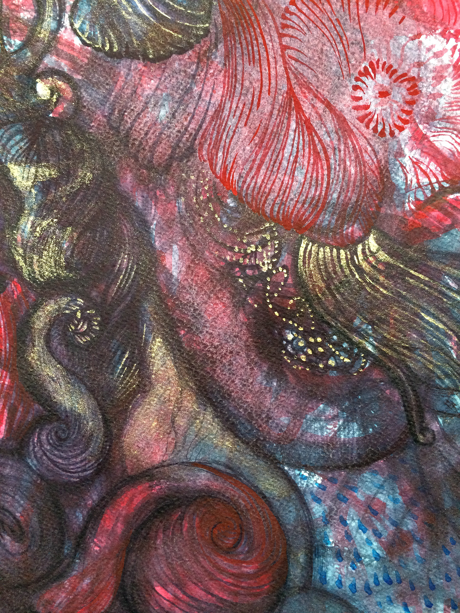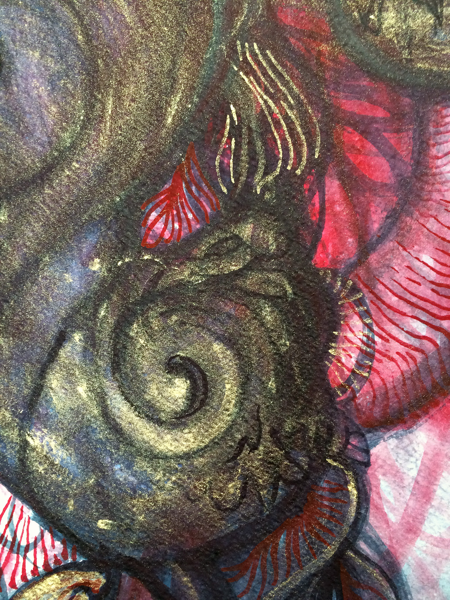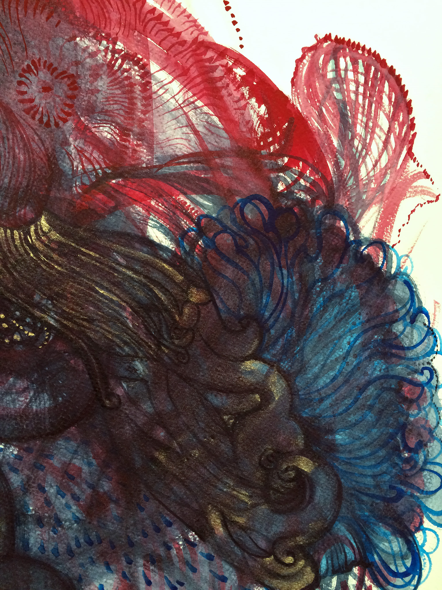 All images published here are details from ‘A Displaced Anatomy’, Watercolour and gold paint on paper, 97.5cm x 220cm.