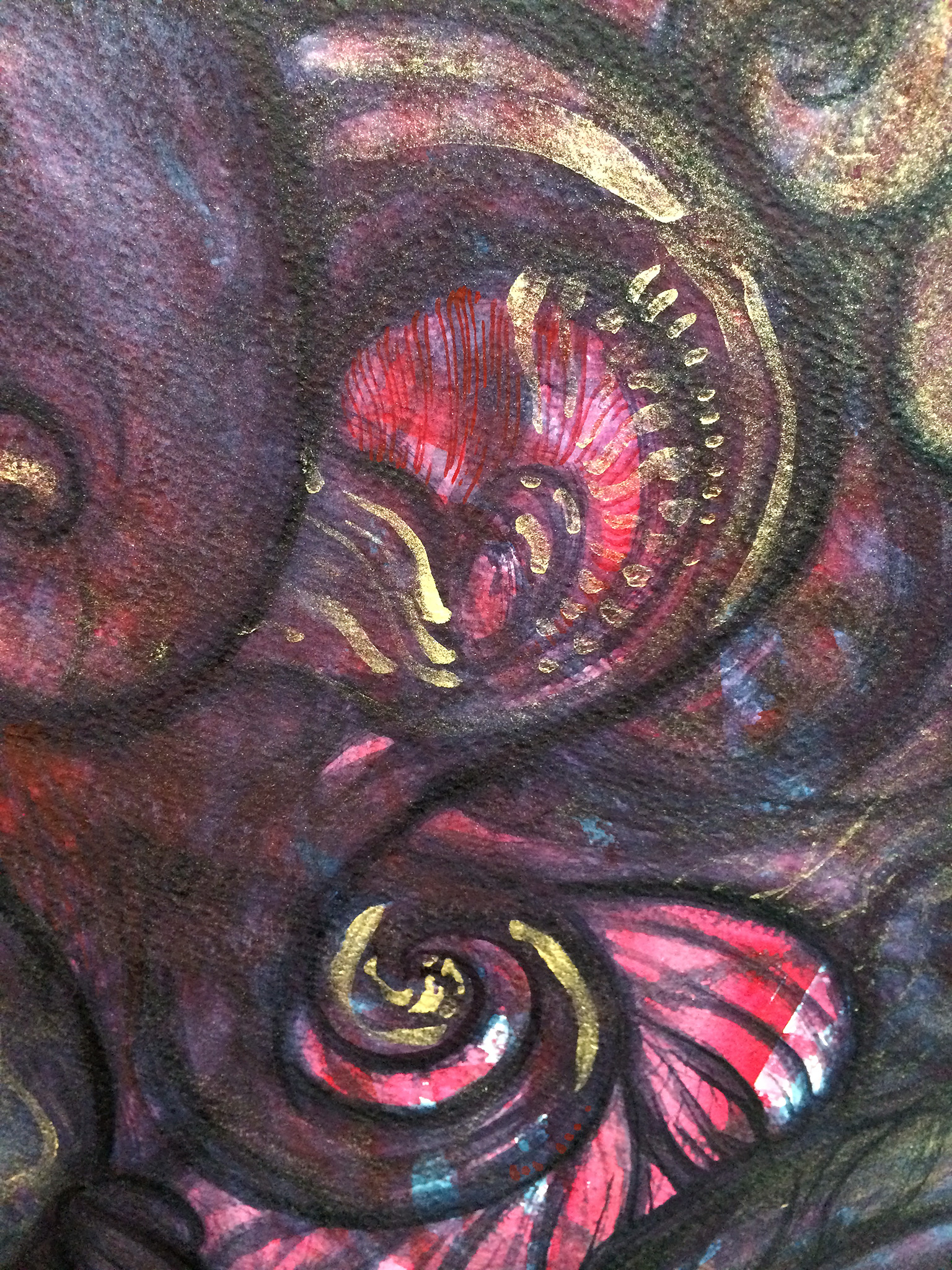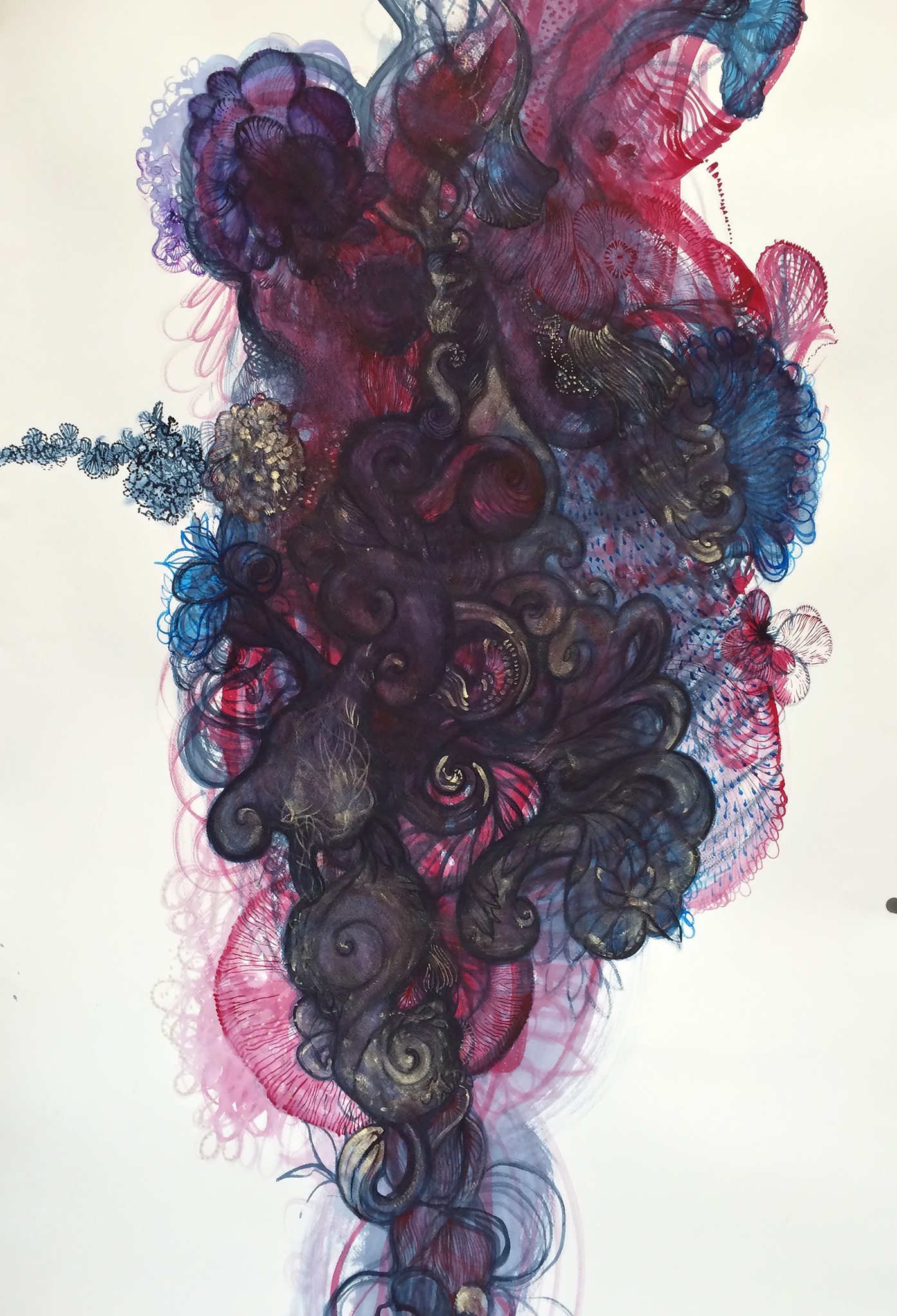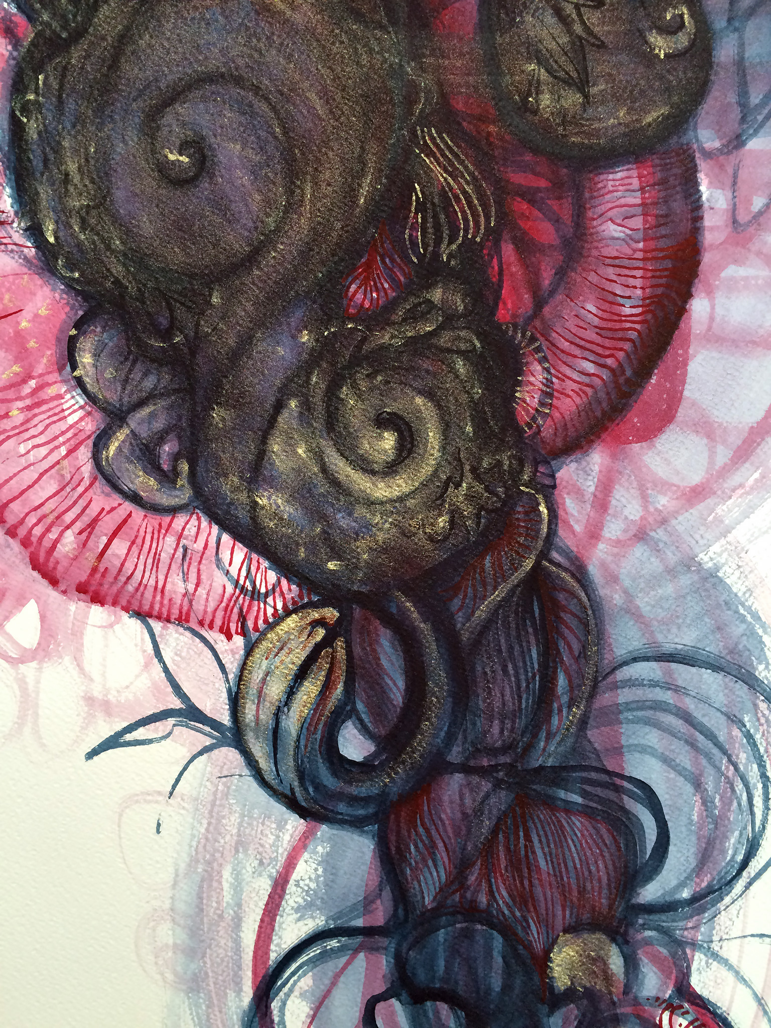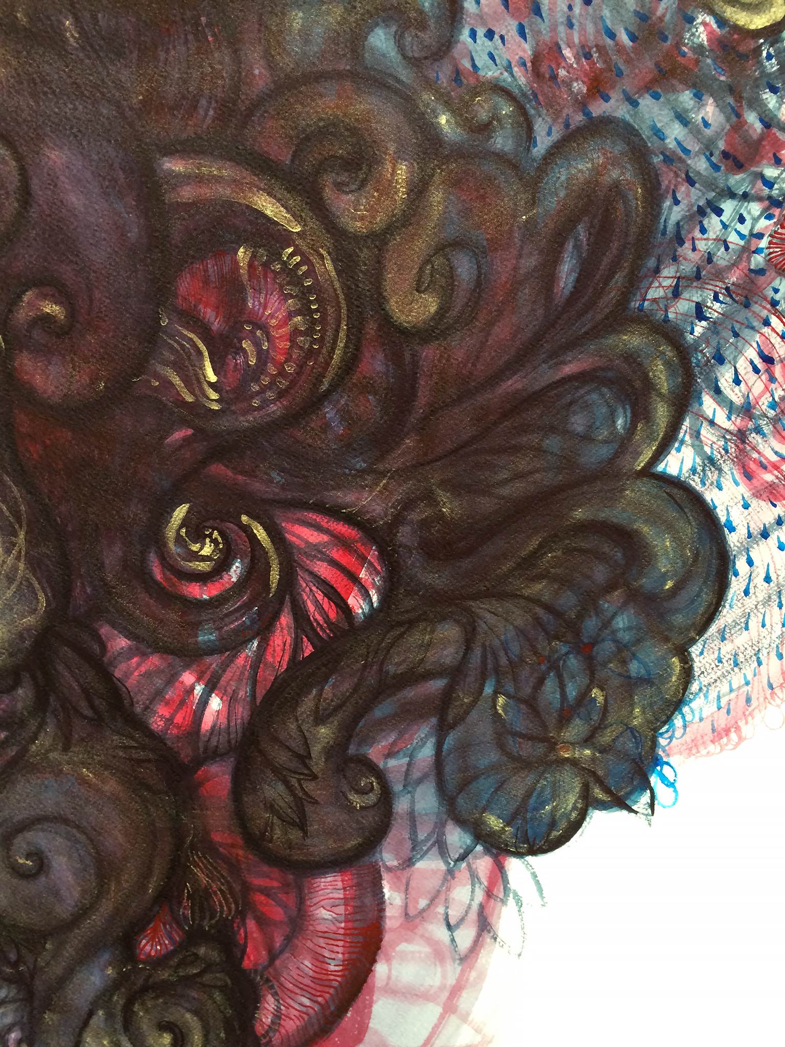 All images published here are details from ‘A Displaced Anatomy’, Watercolour and gold paint on paper, 97.5cm x 220cm.