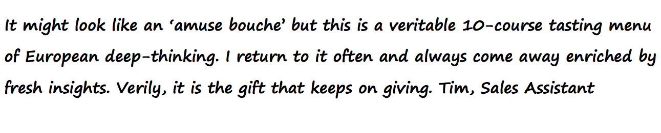 All the profound weight of the European tradition of slim volumes sits upon this slight book, which nestles alongside its kin on a display table at Hatchards in St Pancras International Station. The slightness suggests the rigorous concentration involved in paring it back, trimming it down to size. Every word must count doubly, triply even, especially since it now sits along other works by obscure European writers that are reputed to be densely packed with Meaning, notable for their Profundity. One senses that each sentence must have been sculpted, hewn into existence, somehow providing a lens onto on all that came before it in human cultural endeavour, and yet, at the same time, somehow existing outside of it, detached, and so able to offer a critique of that burdensome cultural tradition.