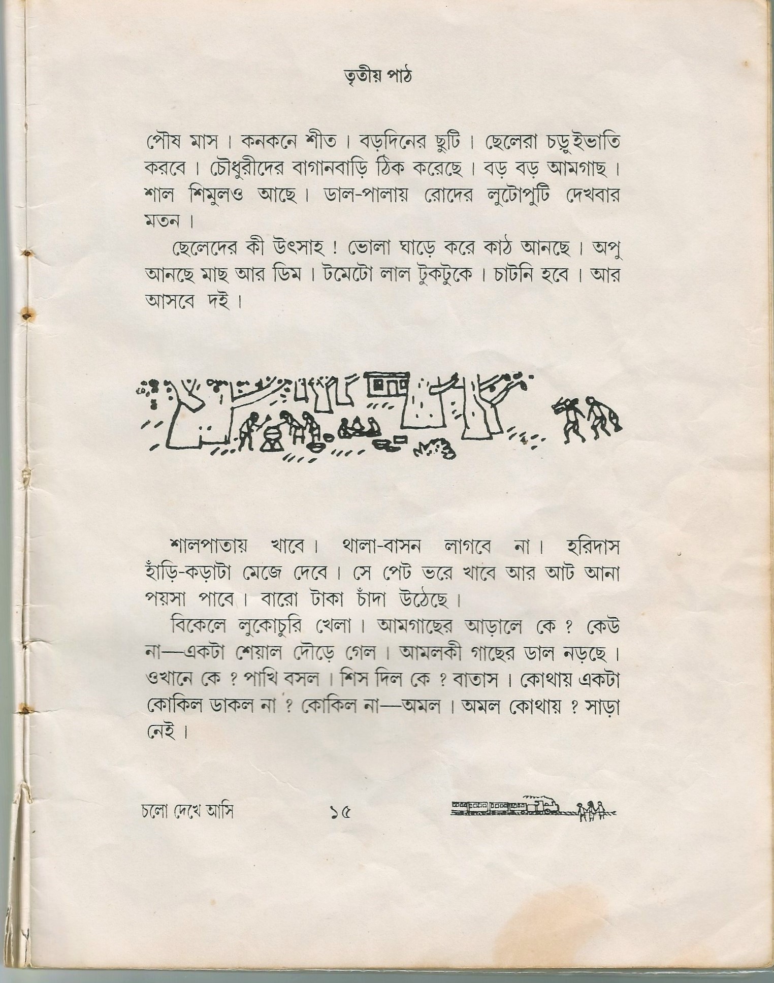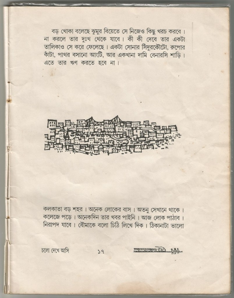 The premise of Chalo Dekhe Ashi is simple: the book is an early reader for children who have just learnt the Bangla alphabet and are slowly learning to stitch syllables together, read words, form sentences. Each paragraph is a vignette comprising words corresponding to the vowel-sounds of the alphabet (our alphabet, like most languages with roots in the Sanskrit and the Magadhi Prakrit, is divided primarily into vowel sounds and consonant sounds). The first vignette is therefore made up of words with the neutral a-sound, the second with the long aa-sound, the third with e-sound, the fourth with ee-sound and so on for the twenty pages of the book. We are taken through forests and villages, amongst trees and animals, introduced to friends and family of the narrator as well as their everyday joys and sorrows – all in the spirit of the title of the book, an invitation to set out together and explore the world: Chalo Dekhe Ashi or Let’s go and see! Although Rabindranath Tagore’s Sahaj Path is the most popular early reader in the language, I never read it. It was always Chalo Dekhe Ashi, which my parents bought for six rupees (yes, six, not sixty) at the Calcutta Book Fair in the early nineties.