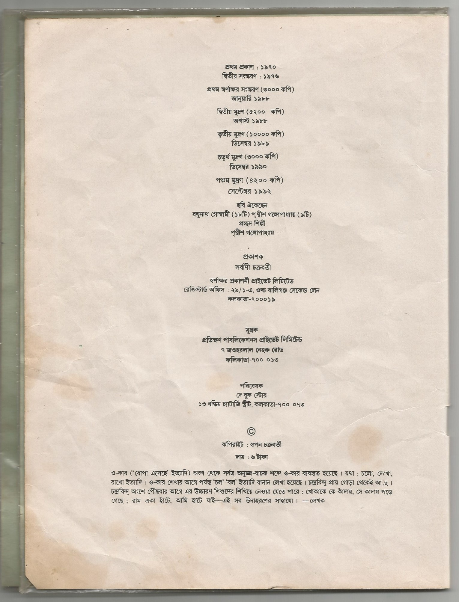 I tell Amarendra Chakravorty I’m a fledgling editor. We discuss sales. I turn to the now-sacrosanct copyright page, something I had probably not even spared a second for twenty years ago. This time, I’m fascinated. Next to the list of editions is marked the number of copies printed. Between 1970 and 1992, 25,400 copies. I also find out that a second illustrator, Prithwish Ganguly, had drawn some of the pictures and the cover illustration is his. And at the end of the copyright page is a clever little note from the author about his choice of inconsistent spelling.
