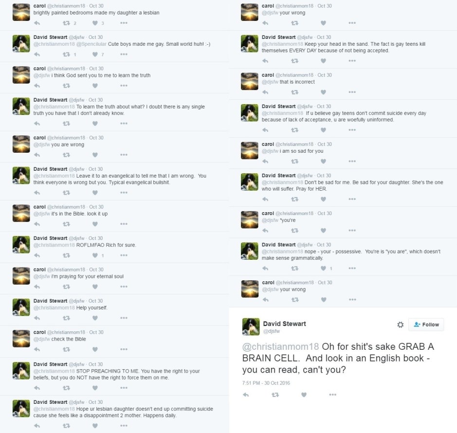 This political power can also be exercised through more humorous means. Meet the honeybot – a bot that posts deliberately controversial statements to bait Internet trolls into arguing with it. Nora Reed’s now-defunct @christianmom18 – which produced bigoted content parodying radical Christianity – and Sarah Nyberg’s @Arguetron – which produces highly liberal statements about controversial topics – are just two honeybot examples. Presumably, trolls are initially unaware that the posts to which they are replying were computer-generated; therefore, when ‘carol’ (@christianmom18) posts that ‘brightly painted bedrooms made my daughter a lesbian’, unknowing Twitter users such as David Stewart (@djsfw) respond as through this were a genuine belief broadcasted by a radical individual. When the honeybot promptly replies to a Twitter mention, as many honeybots are programmed to do, it becomes increasingly obvious that a human is not directly responsible for the content in question. Yet some Twitter users nevertheless appear unfazed, and attempt to combat the bots (image: conversation occurred 30 October; screen captured 1 November 2016).