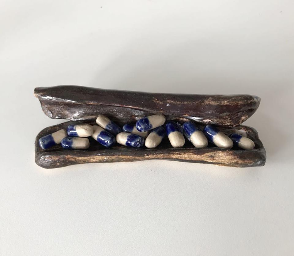 Images: Razor Clam With Painkillers, 2018, glazed stoneware, by Richard Porter.