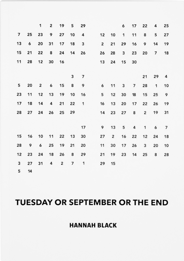 Hannah Black is an artist and writer from the UK. She lives in New York. She has written for a number of publications including The New Inquiry, Artforum, and Bookforum. Her previous books include Dark Pool Party (2016) and Life (2017, with Juliana Huxtable). She is represented by the galleries Arcadia Missa in London and Isabella Bortolozzi in Berlin. Tuesday Or September Or the End is published by Capricious.