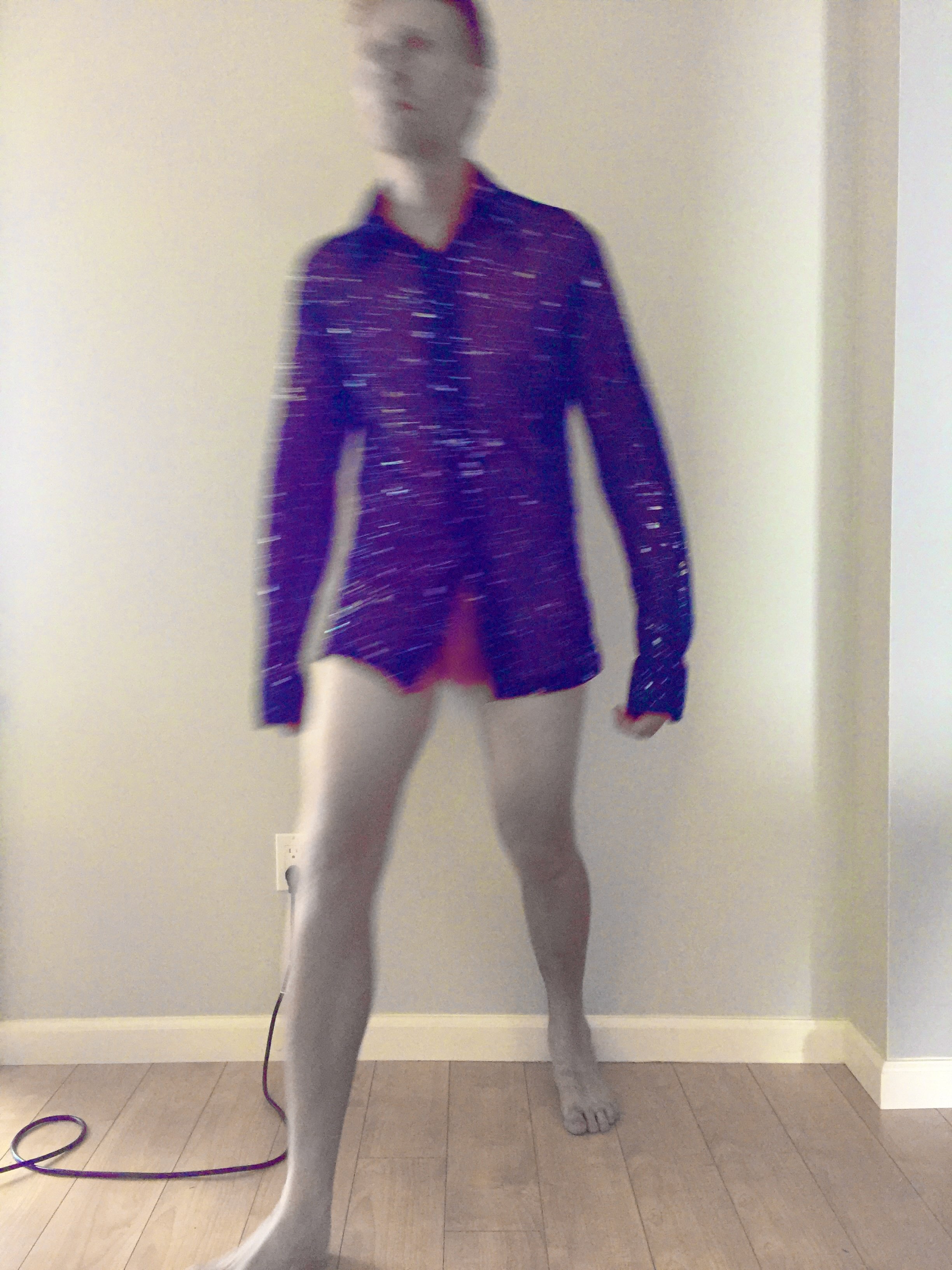 These photos are from my new poetics/image project, “Purple and Dissonance.” I’m wearing a silver-splashed transparent black shirt—enhanced here with color—that I asked my mom to buy me in my earliest days of coming out in 1998. By asking her to buy it, I was asking her to accept the possibility that I would wear something that shows my body. My soon-to-be-out body. But I never wore it. Except for seeing it in the mirror, it never left the house. Then, a few years ago, pulling it from a box of memories, I set up my phone to capture a series of movement photos wearing nothing but the shirt. Modeling vulnerability in the hope that finally, still, I am seen as, I see as, the person I have always been. My body owes my rumination nothing. My body prefers to dwell on the possibility that Its fear has been in service of, a student of, wonder, beauty, and self-actualization all along. Fucking bodies… leave ’em alone.