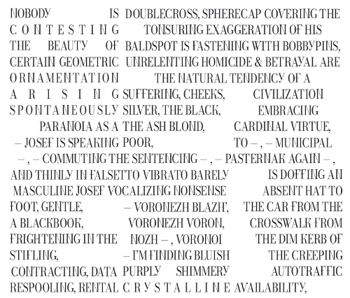 The second difficulty is the silence. I don’t read Russian. My sense of Mandelstam is like walking down a dark hall by feel, by other people’s aggregate translations: Davis, France, Wiman, Brown and Merwin. Then again, a blindfold makes you more sensitive to sound after a while. Then again again, the second order isn’t by nature always inferior. So let’s be difficult together, dearest, my little zvezdochka. This is what Massive is for. When I got it in the mail I thought it was a concrete brick for sculpture. It was actually a galley of a maybe-novel, a book by John Trefry, forthcoming form Inside the Castle press, about among other things, Mandelstam, cruelty, architecture, the etched lines of point, grid, plane, and particular geographies. It is in three fluvial -architectonic columns of sparsely punctuated stream of consciousness solid prose noise, punctured by data. You might hate it, actually, but that’s the point isn’t it, the assumption of risk. The novel, after all, is in some senses a primarily bourgeois form originating in the 19th century, and if the economic era of the bourgeois is exploding into neo-feudal technocratic atrocity, don’t we need a new form? Fat fingers, an axe. Anyway Massive feels like the raw feed of the consequences before the form exists quite yet. Massive isn’t so much an act of reading as of the scream burbling up. This is not a story you tell yourself in order to live, this is not a story, this is a thing that reminds you living is always bound up in the complicities of silence, and that the traditional form of the novel is sometimes one of those complicities. Massive offers something otherwise.