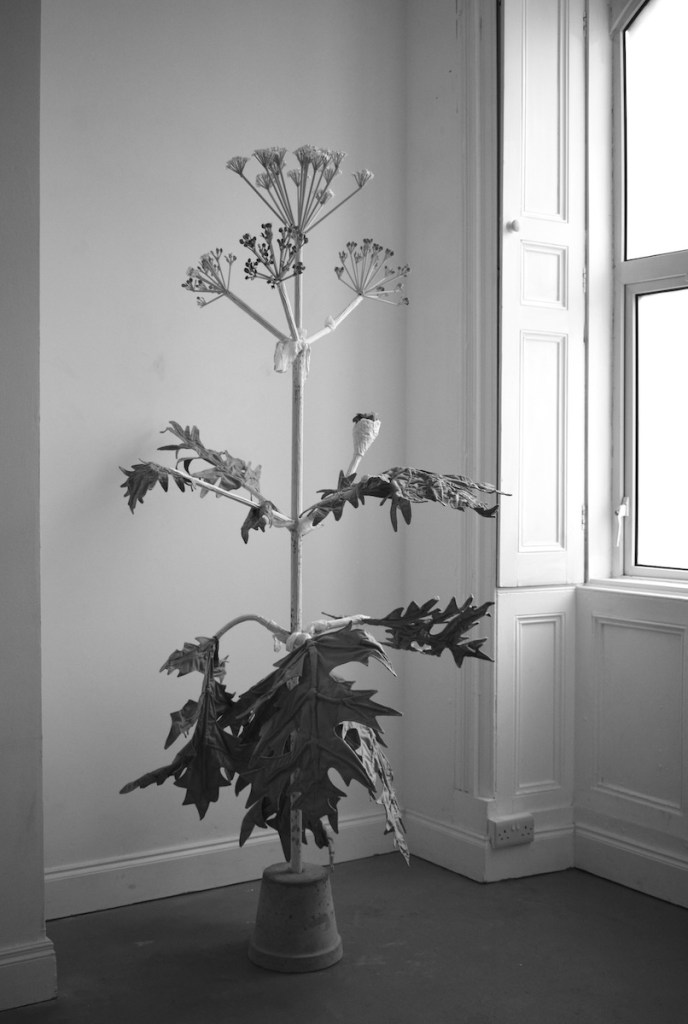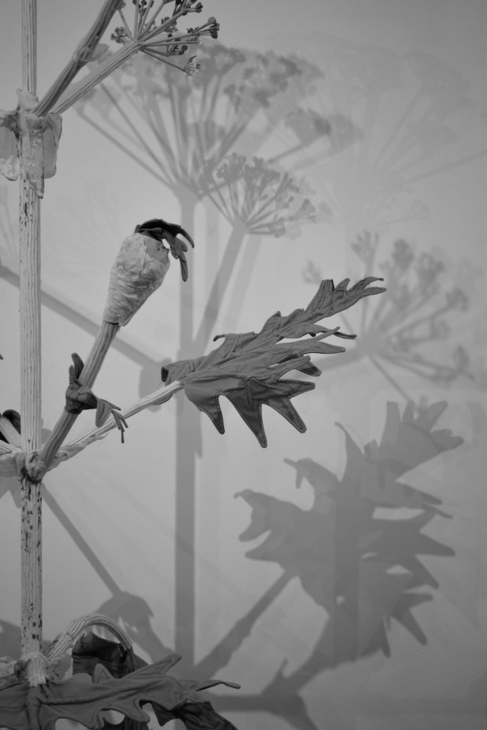 Giant Hogweed stands two metres tall, a dowel structure rooted in an upside down bucket cast in concrete. The stout, ridged stem iswrapped in pale green rope glued together and splashed with blotches of purple paint.. The nodes are sheathed in white silk with further purple stains, from which the leaf stalks branch out. The leaves are cut from cotton fabric and sewn along the petioles and stipules which are articulated by hidden wires. The sculpture culminates in four compounded umbels at different stages of flowering and seeding: the rays of the cluster are made of wooden sticks painted green, each supporting smaller rays made of orange matches and topped with small cut out pieces of white fabric to figure its inflorescence.