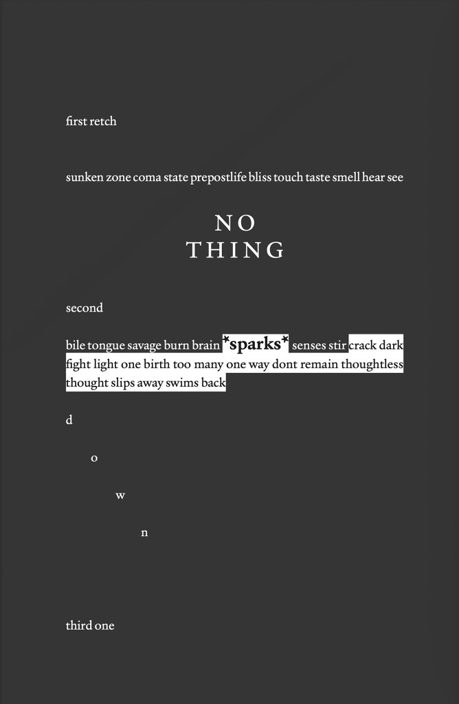 sinks back spent lumpy chair slept when time no more head pounding blood pumping tumescent mess brain tissue throbbing vein could pop just like that end whole sorry scene teeth chattering lips contorting parodic ecstatic gurning muscles wracked iceblood shivers pumice stone tongue mouth hot desert sand wasted arms fleshless ribs brief warmth sick shirt cooling clinging cloying chill spinning slowing living room wreck spinesnapped sofa dead tv fireplace mirror shattered object hurled fury lost unremembered blur indeterminate past curtains torn sunshine spewing double glazed glass splashing winewhite light stains floor